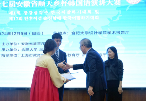 In the finals, students from 26 universities showcased their talents in fluent Korean. After fierce competition, Wang Jiawei from Nanjing University won the Grand Prize, while Xu Wenbin from Zhejiang Dongfang Polytechnic earned the Gold Award. The Silver Awards went to Xiang Yirui from Shanghai International Studies University and Guan Ya’nan from Anhui University of Chinese Medicine. Bronze Awards were presented to Wang Jiaojiao from Hefei University, Zhou Jingwen from Anhui Foreign Studies University, and Shi Li from Yancheng Teachers University. Vice President Kim and Vice President of HFU, Chen Xiu, along with other officials, presented the awards to the winners and their tutors.