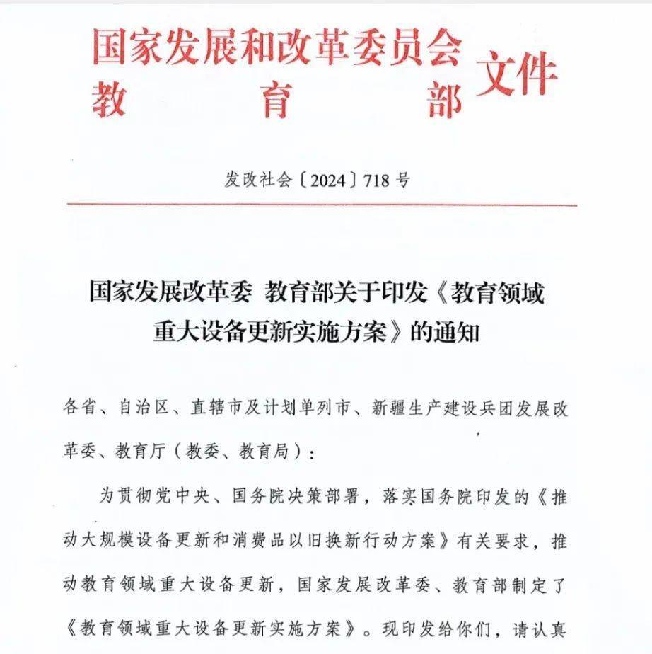 為響應(yīng)黨中央、國(guó)務(wù)院關(guān)于推動(dòng)大規(guī)模設(shè)備更新和消費(fèi)品以舊換新的決策,國(guó)家發(fā)改委、教育部制定并印發(fā)《教育領(lǐng)域重大設(shè)備更新實(shí)施方案》,以促進(jìn)教育領(lǐng)域重大設(shè)備更新,主要涵蓋普通高校與職業(yè)院校的關(guān)鍵設(shè)備升級(jí),旨在支持科技創(chuàng)新與高質(zhì)量教育發(fā)展。以下為方案全文: